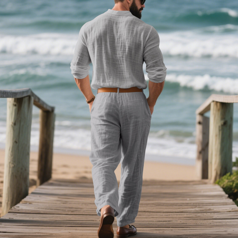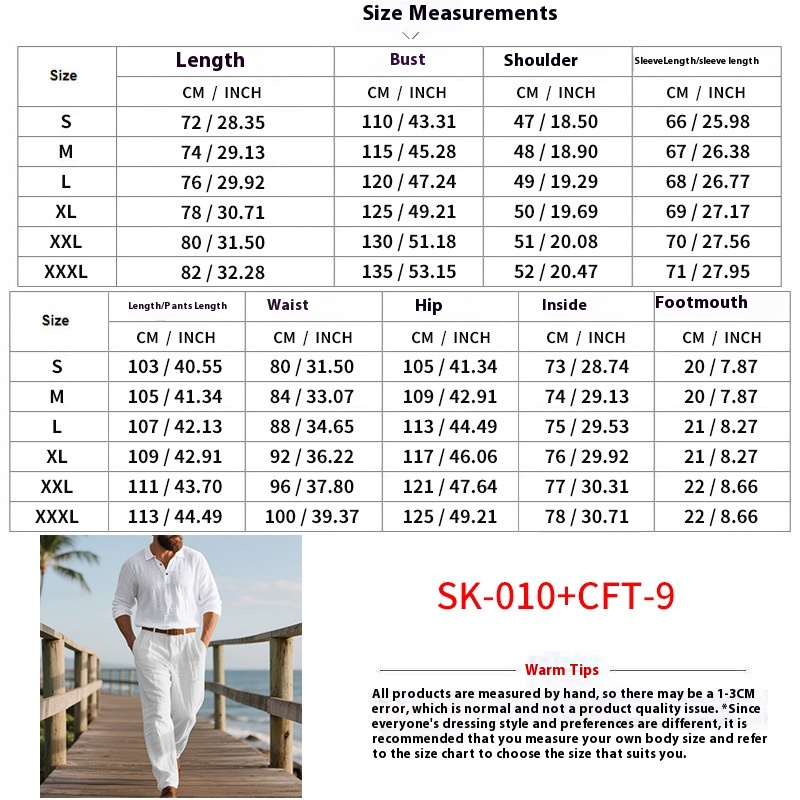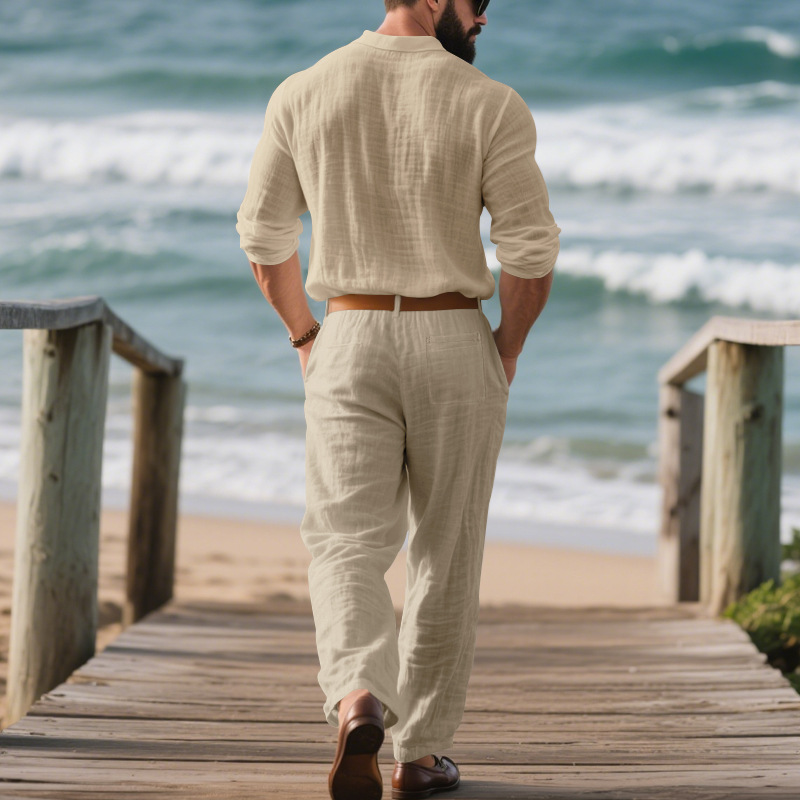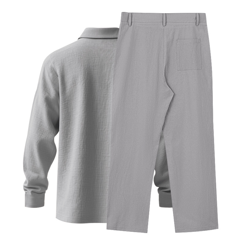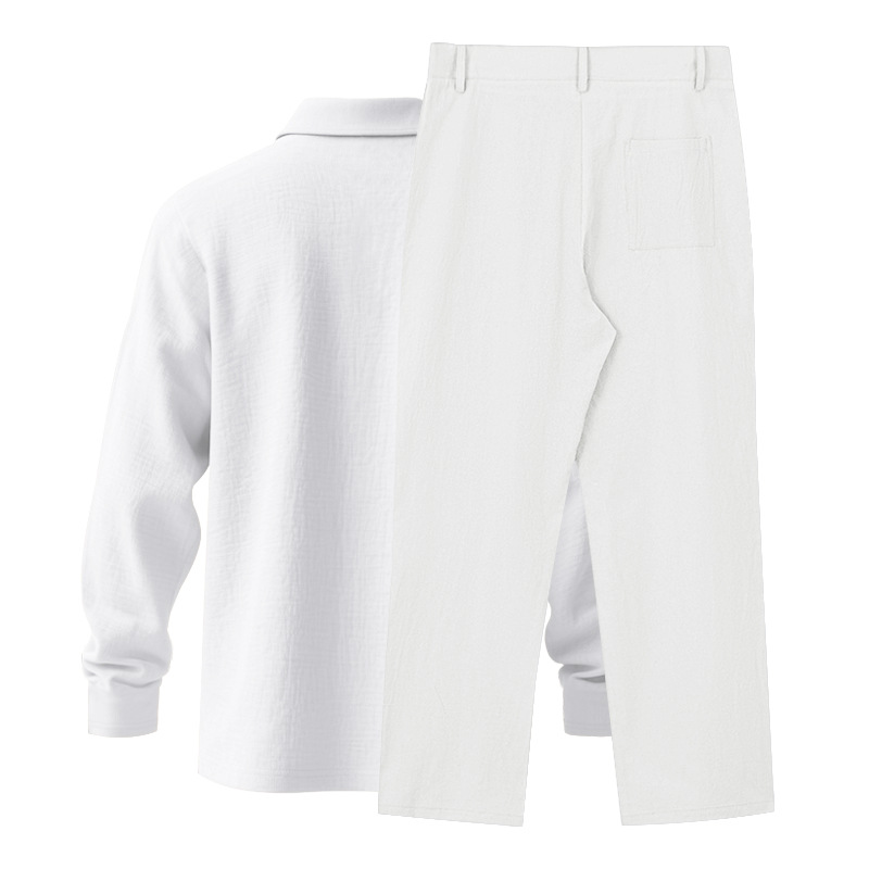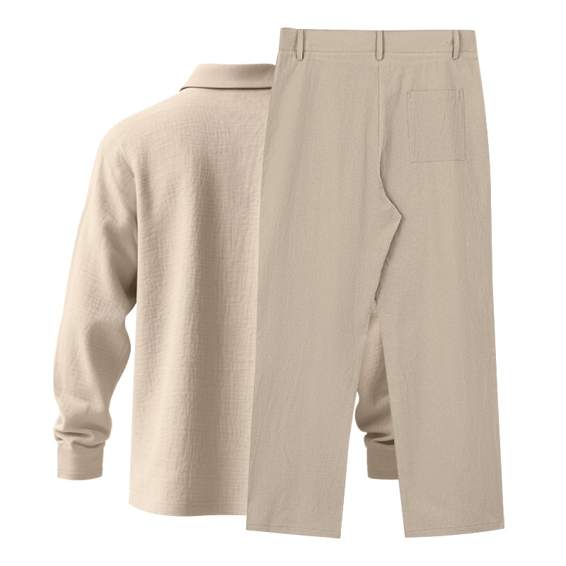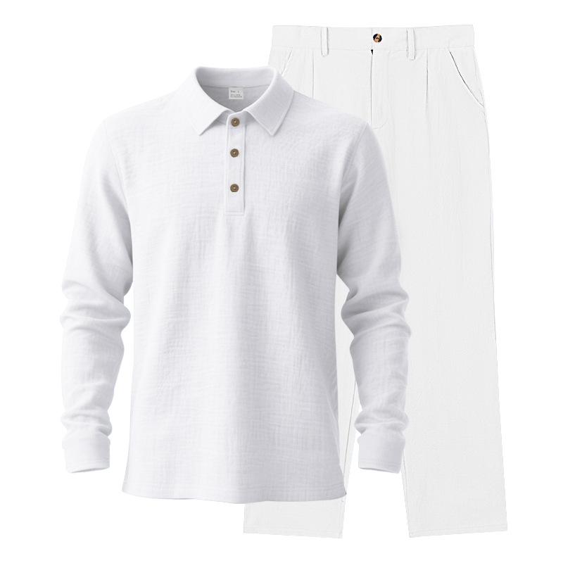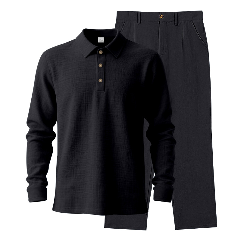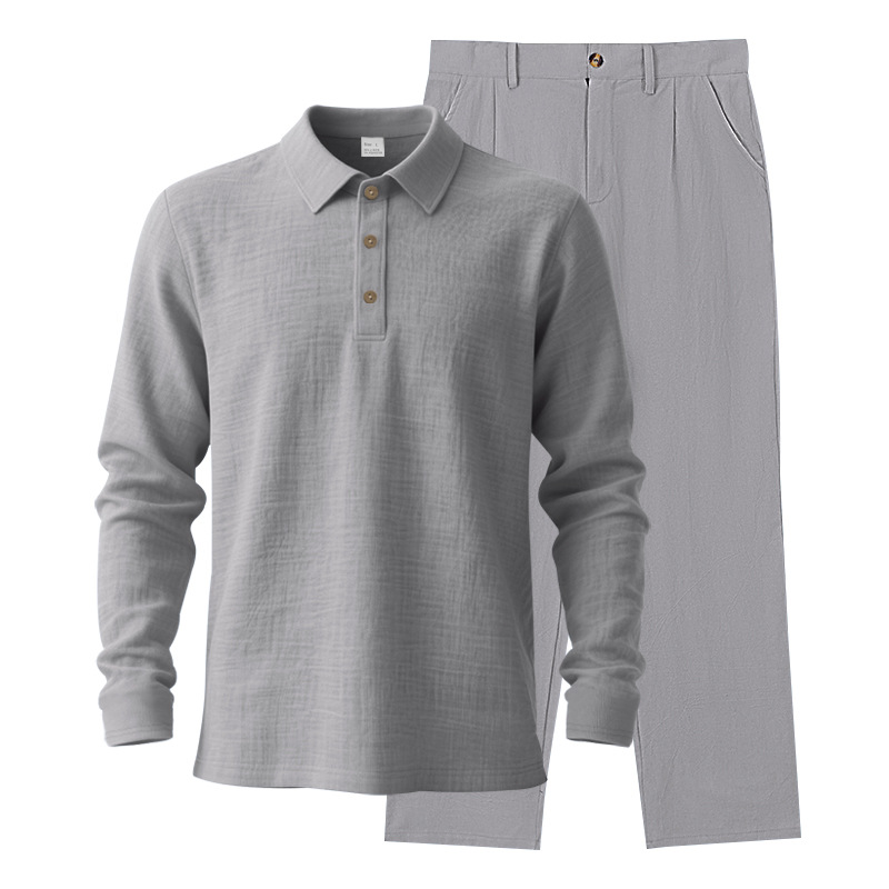 Men's Linen POLO Long-sleeved Trousers Casual Suit Solid Color Two-piece Set